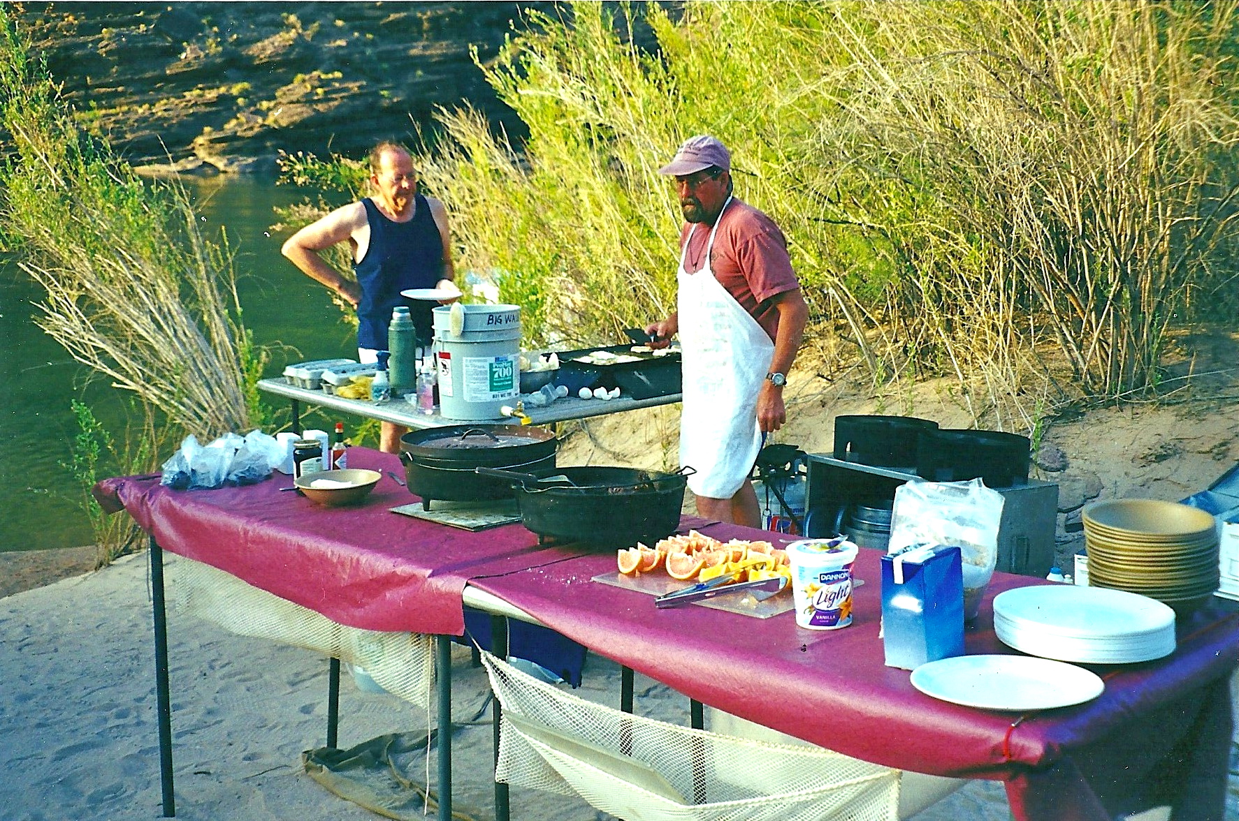Breakfast on the riverbank: bacon, eggs, pancakes, yogurt, fruit, coffee. The captain was also the cook. The food was fine. He’d wake us early each morning with a long, loud call: Coofffeeeeeeee is Readyyyyyyy…. echoing through the canyon.